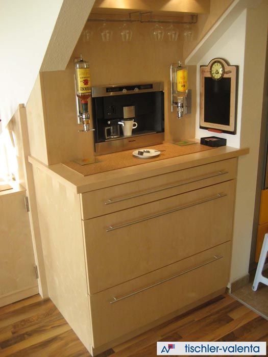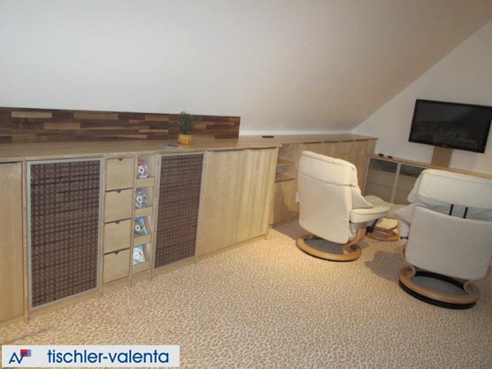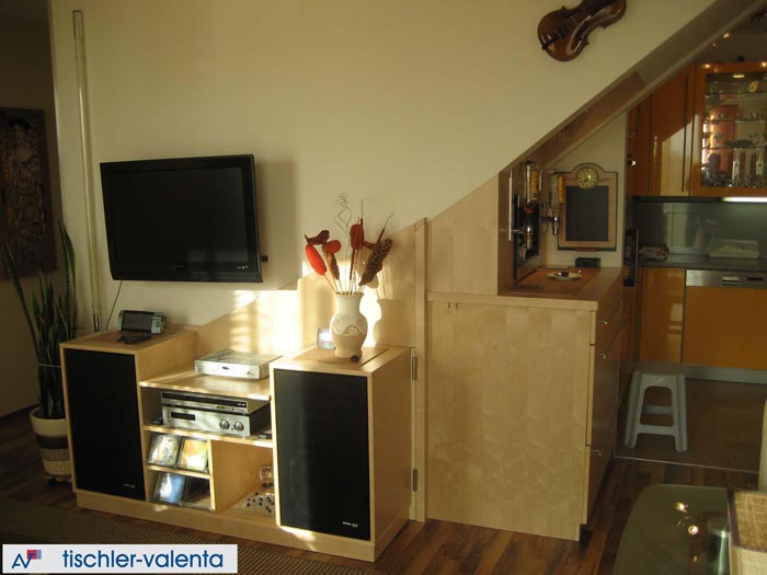Wohnzimmereinrichtung in Esche furniert, Barmöbel unterhalb einer Stiege, schwenkbares HIFI-Regal.