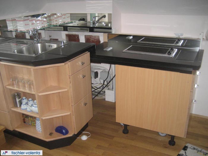 Eine Kleinküche auf einem Raum von 1,1 x 1,2 m die alle Stücke spielt. Ein Kästchen ist ausziehbar um den Zugang zu den Putztürln