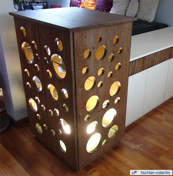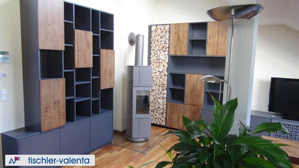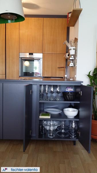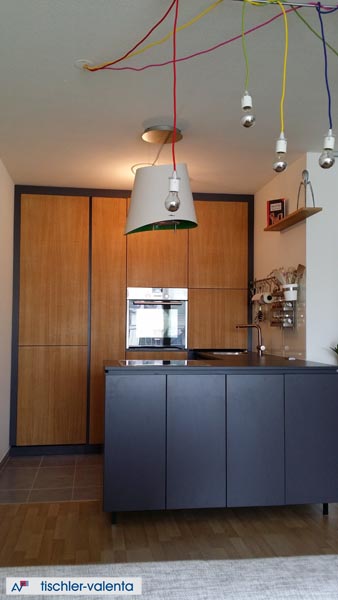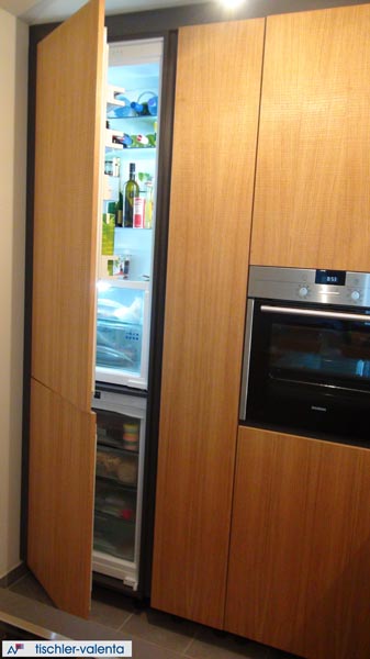 Die Fronten sind Alteiche furniert auf Eiche massiv. Die Designtür "Ofenscheiter" wurde unter Mitarbeit der Auftraggeberin gestaltet.