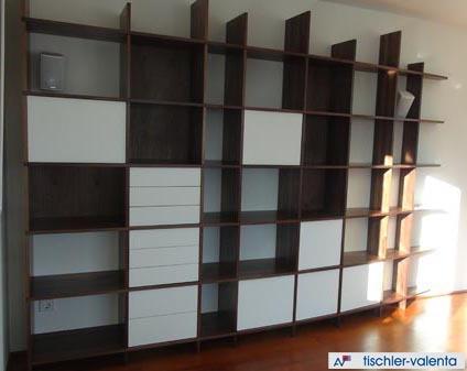 Regal in Schwarznuss massiv geölt,Schubladen Nuss massiv gezinkt und geölt Fronten MDF weiß lackiert, ohne Griffe Tip On.