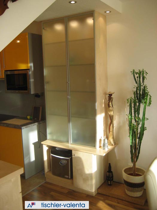 Raumteiler in Fichte Safran, Satinato-Verglasung.