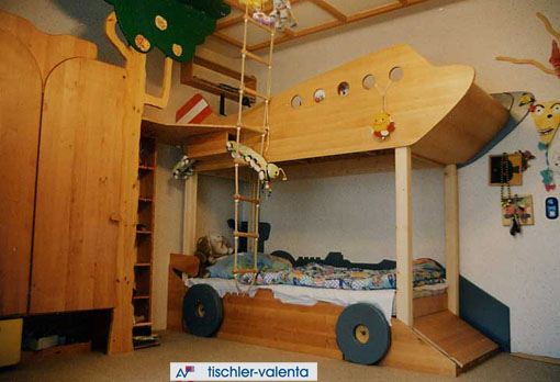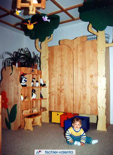 Einrichtung für Kleinkinder, Korpus außen und Fronten Erle 3-Schicht Massivplatten, Korpus in Fichte massiv. Alles gewachst, färbige Flächen mit Aquafarbe lackiert.