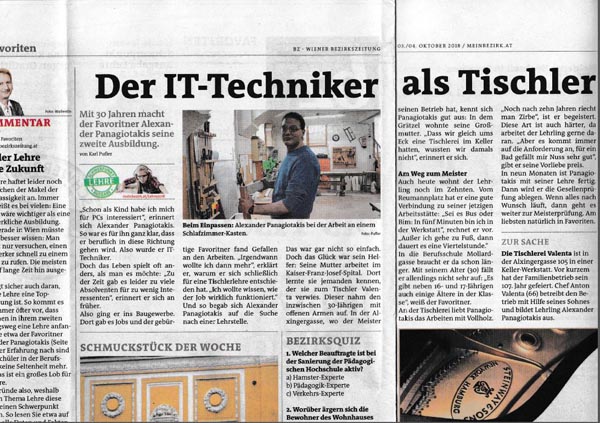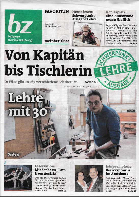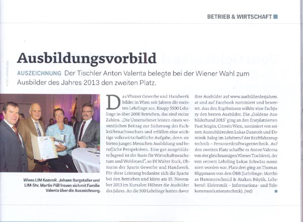 Bedeutende Anerkennung für unsere Lehrlingsausbildung erhielten wir bei der Verleihung "AUSBILDER des Jahres 2013" derSparte Gewerbe und Handwerk der WKO-Wien. Auf Initiative unseres Lehrlings Lukas Schwärz nahm unser Betrieb teil und erreichte den 2. Platz. Für uns ist es Ansporn auch in Zukunft Jugendlichen die Möglichkeit zu bieten, in familiärem Umfeld mit Freude an erbrachter Leistung den schönen Beruf eines Tischlers zu erlernen,obwohl idealistisches soziales Engagement erforderlich ist.